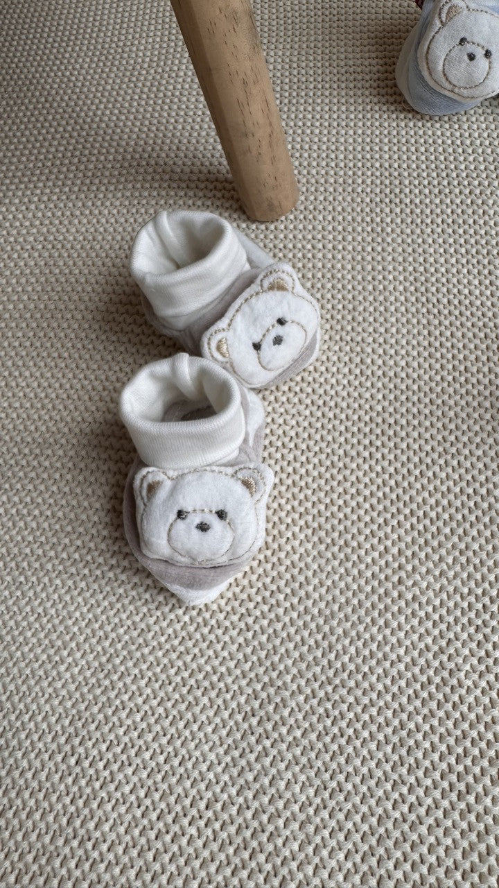 Bej Peluş 3D Ayıcıklı Kadife Bebek Patiği