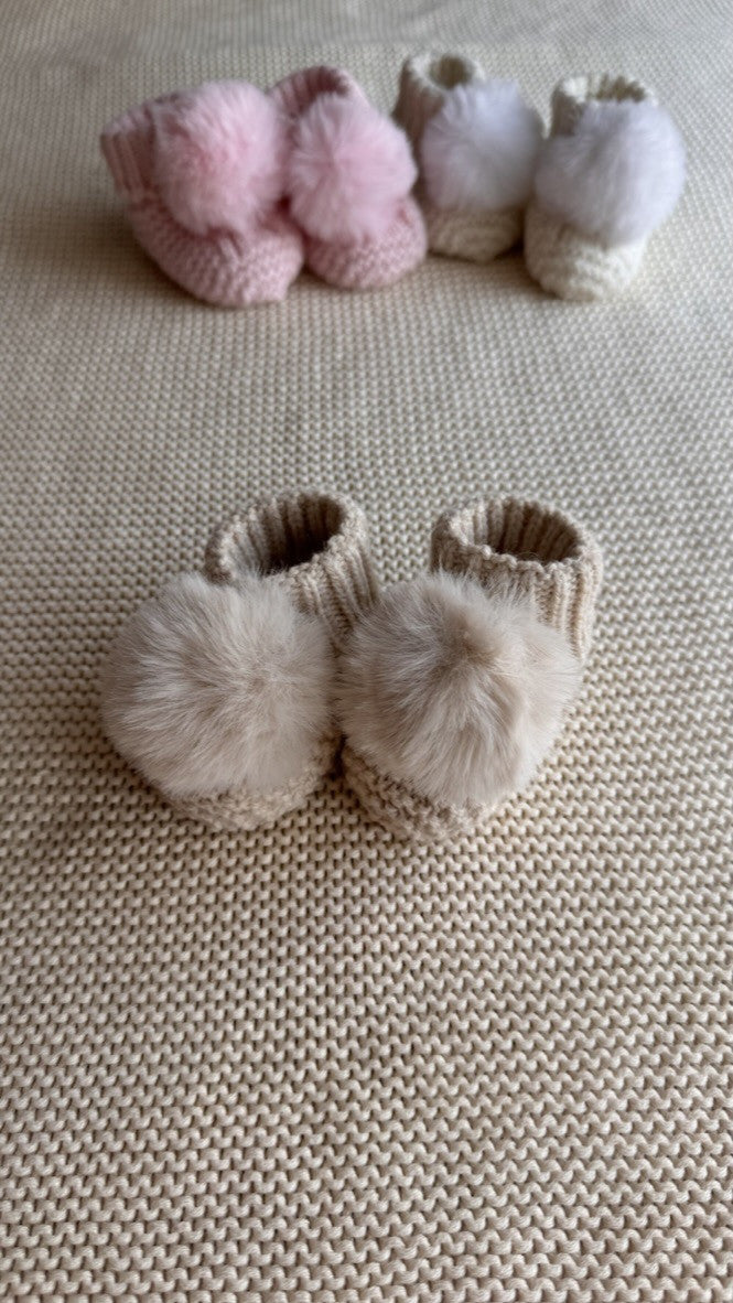 Bej Tüylü Ponponlu Saç Örgü Patik