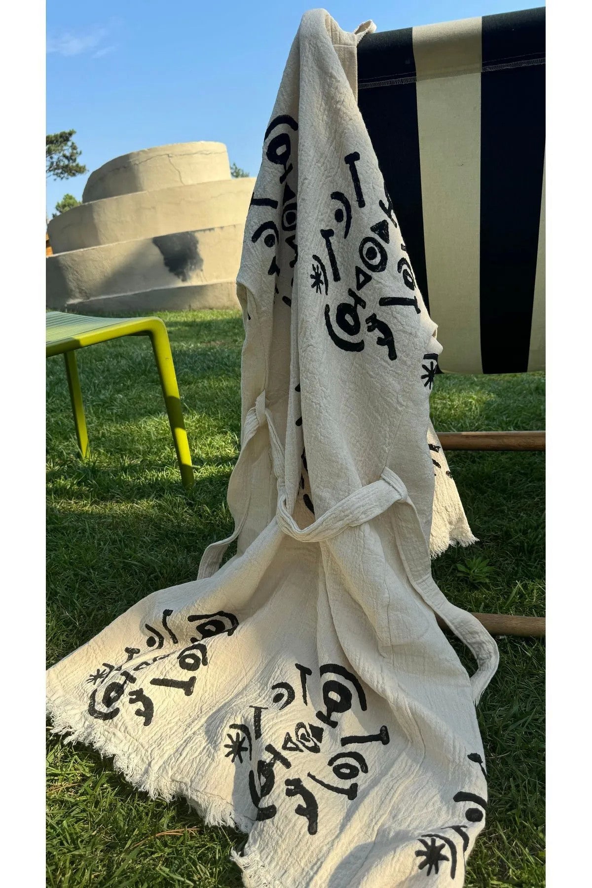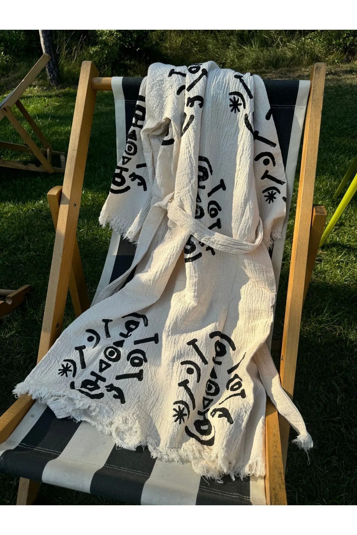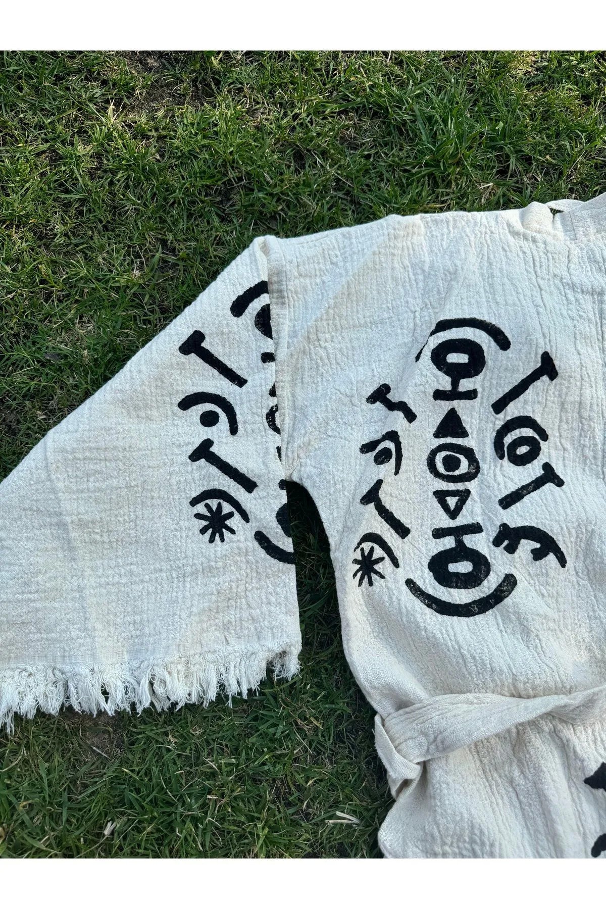 2. **Kumaş ve Dokuma**: El dokuması olarak üretilir. Bu, her bir kaftanın özenle ve özgün olarak üretildiği anlamına gelir. Yüksek kaliteli Ege pamuğundan üretilmiştir.