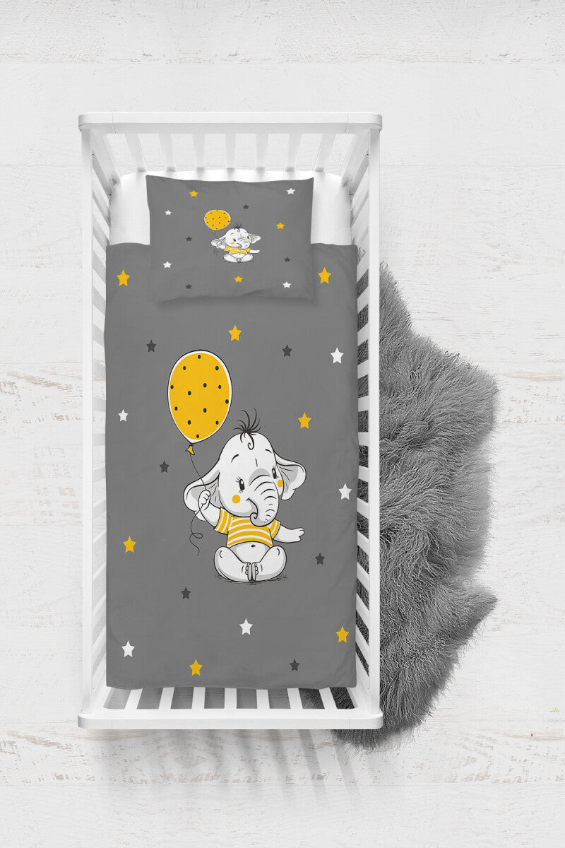 Gri Fil ve balon desenli pamuk saten 3'lü erkek bebek nevresim takımı.