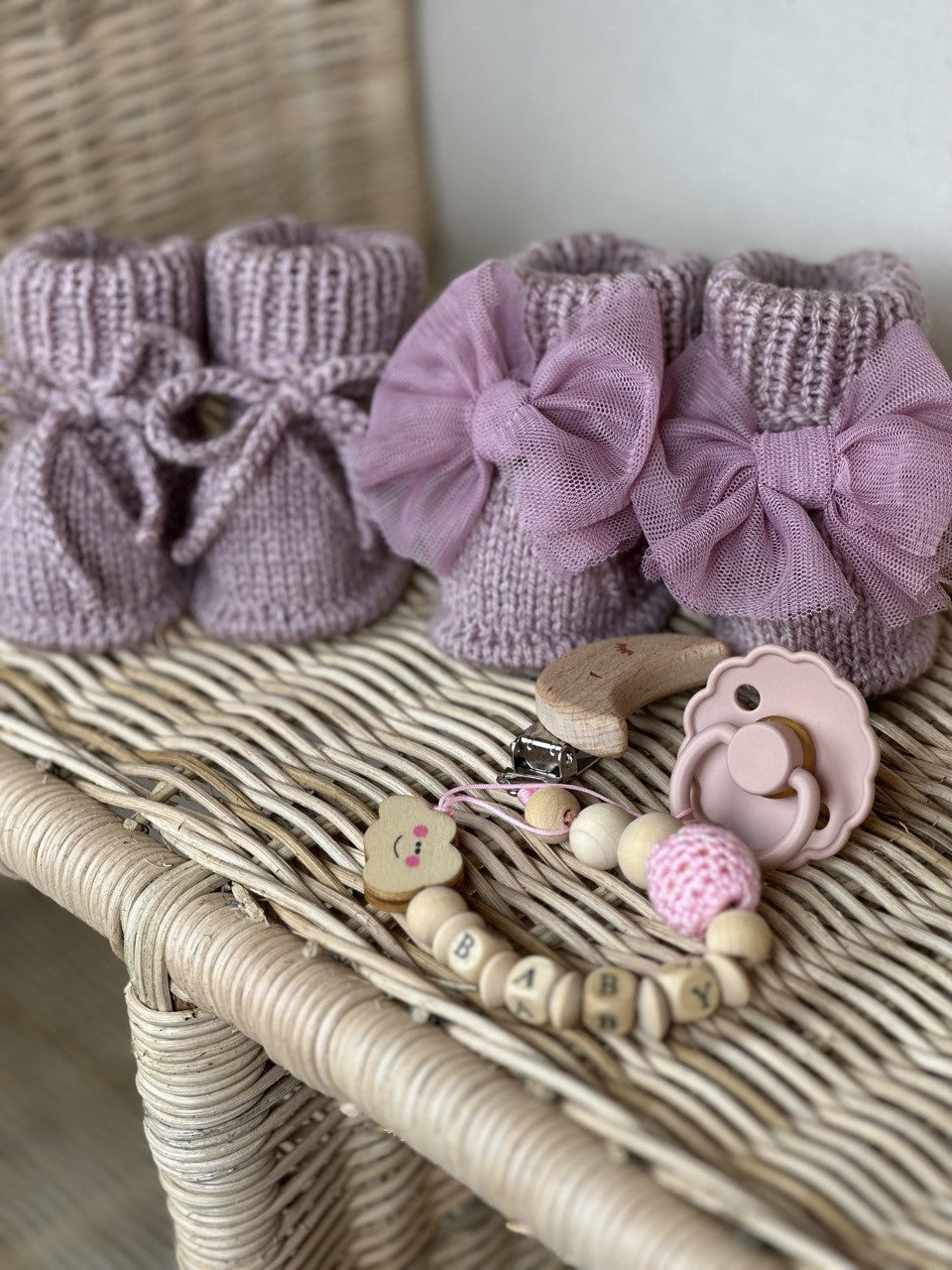 Handmade örgü fiyonk detaylı kız bebek patiği, özenle el işçiliğiyle üretilmiş ve şıklığıyla dikkat çeken özel bir üründür. Üzerindeki fiyonk detayı, patiğe zarif ve şirin bir görünüm kazandırır. Günlük kullanım için ideal olmakla birlikte, özel günlerde de bebeğinizin stilini tamamlar. Kaliteli ve dayanıklı yapısı sayesinde uzun ömürlüdür. Hem şık hem de işlevsel bir tasarıma sahip bu patik, hediye olarak da tercih edilebilir.