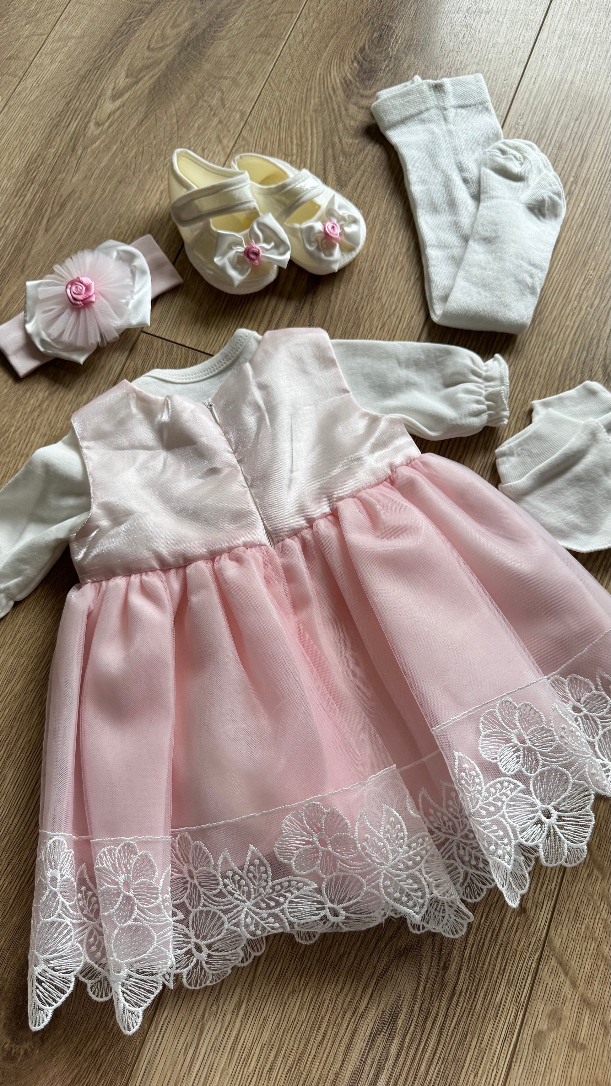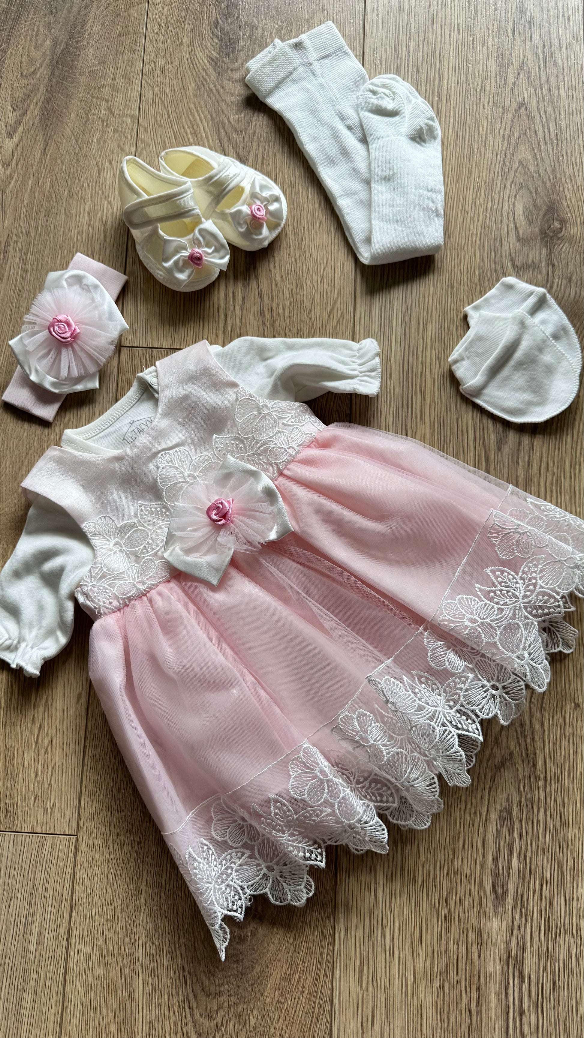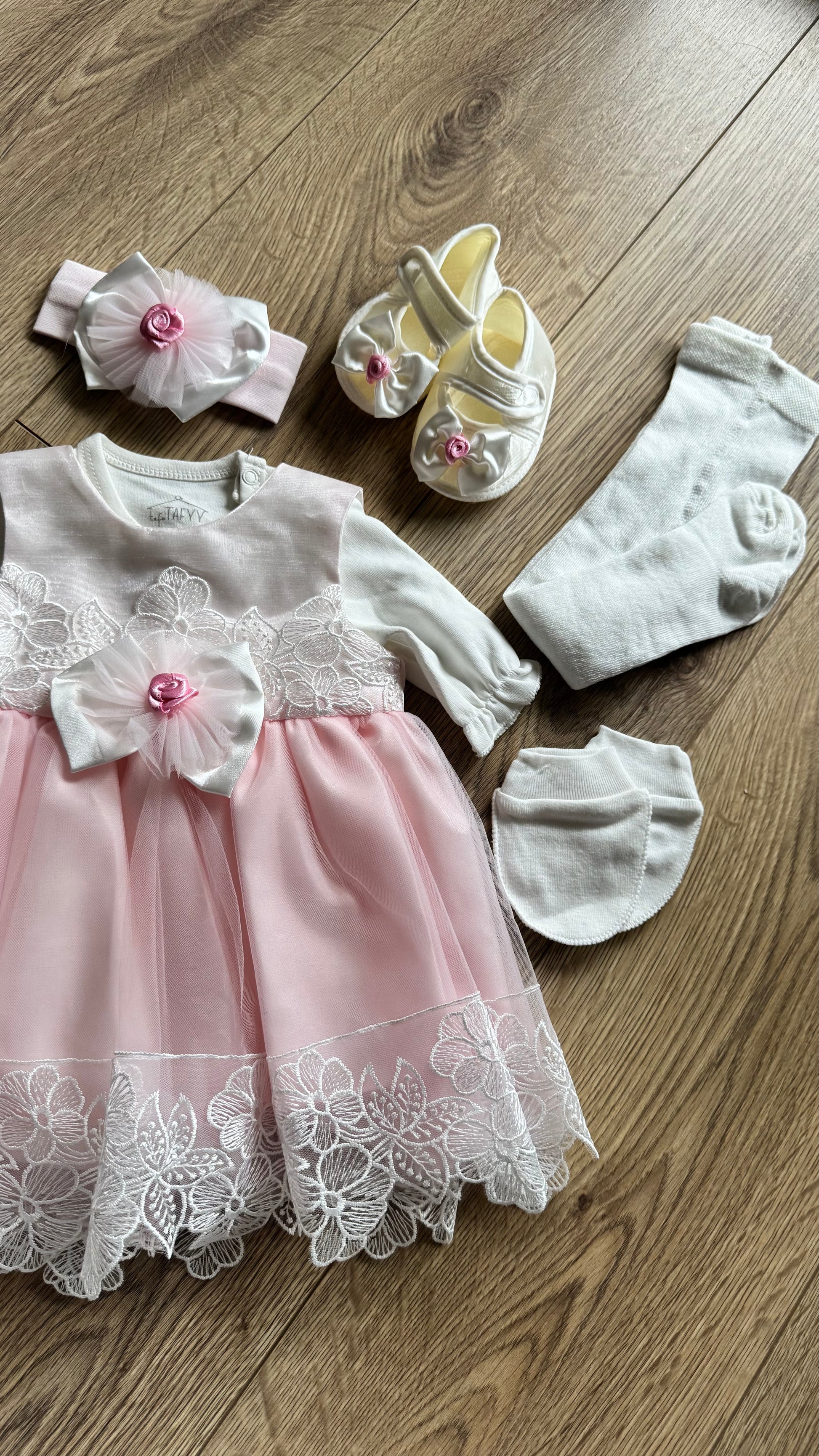 - Güpür detaylı, 6 parçadan oluşan kız bebek takımı.