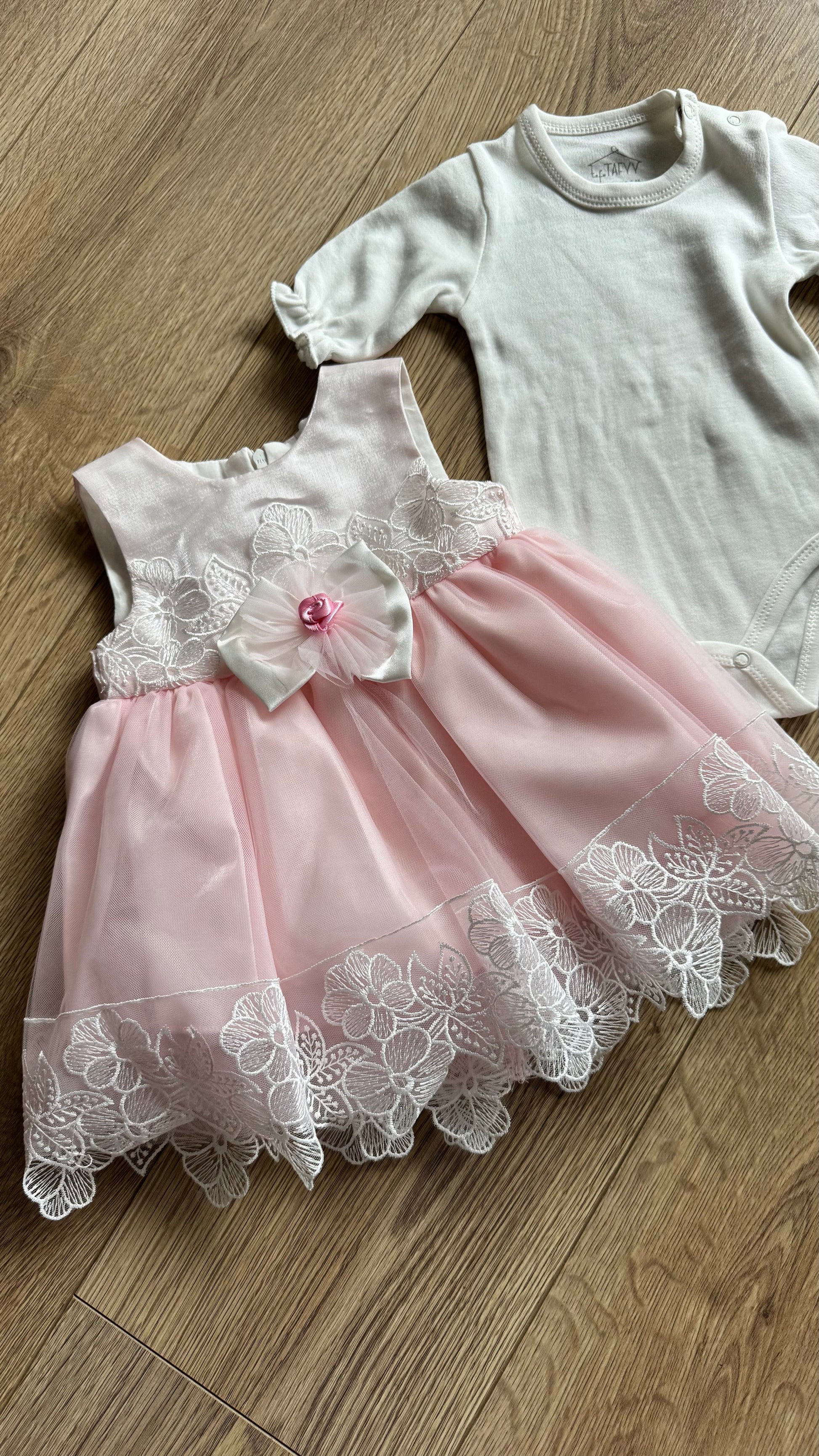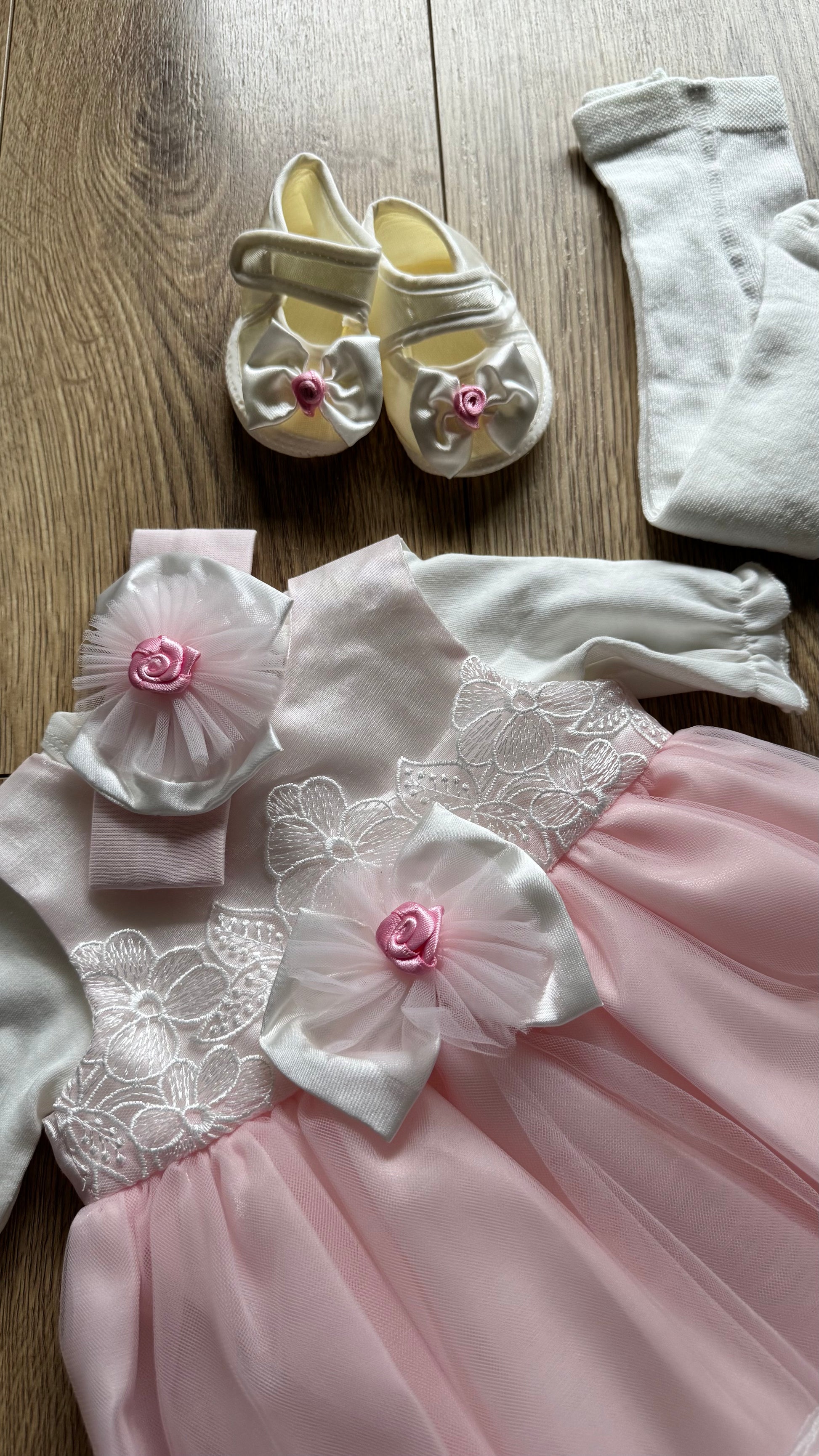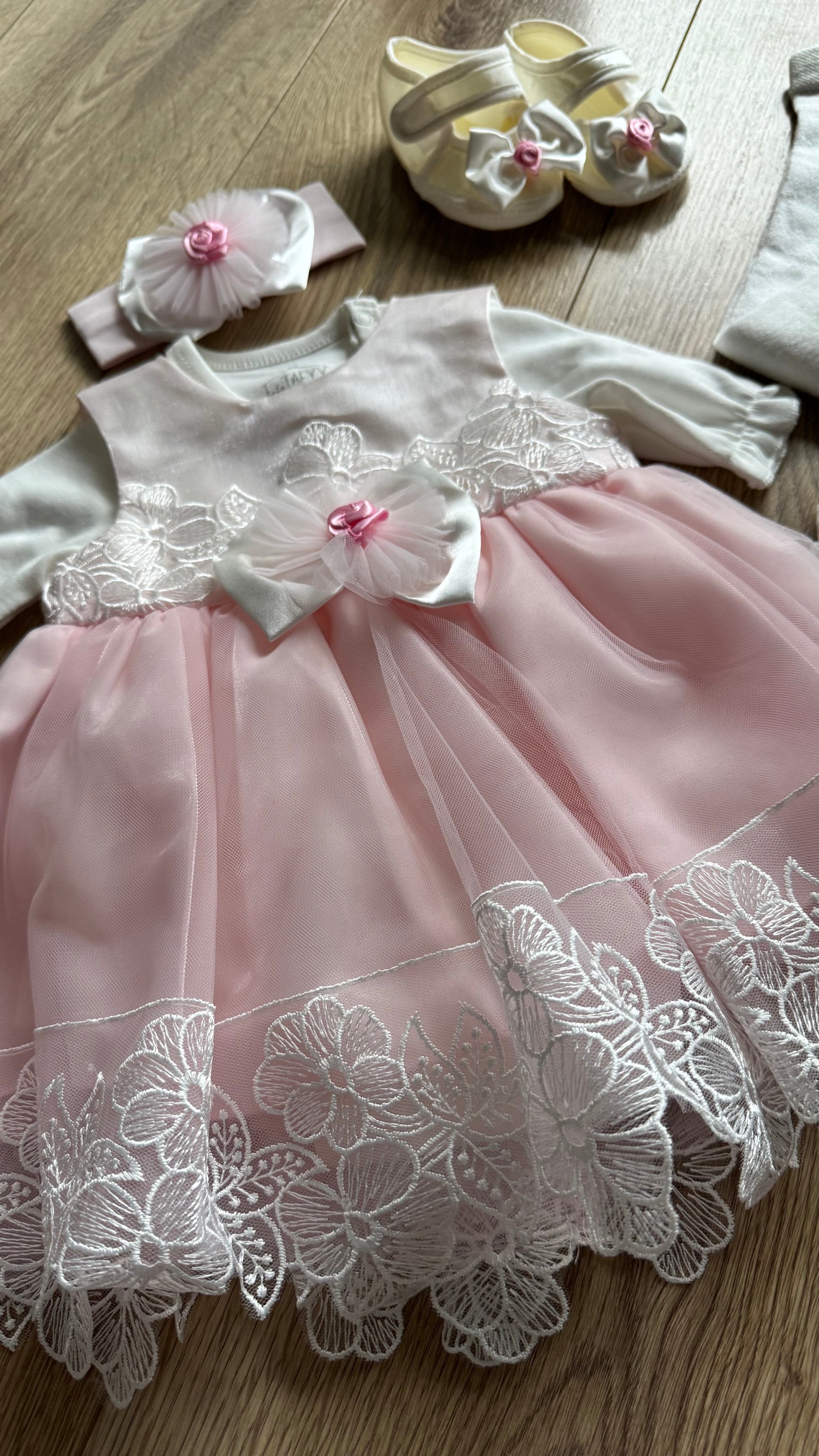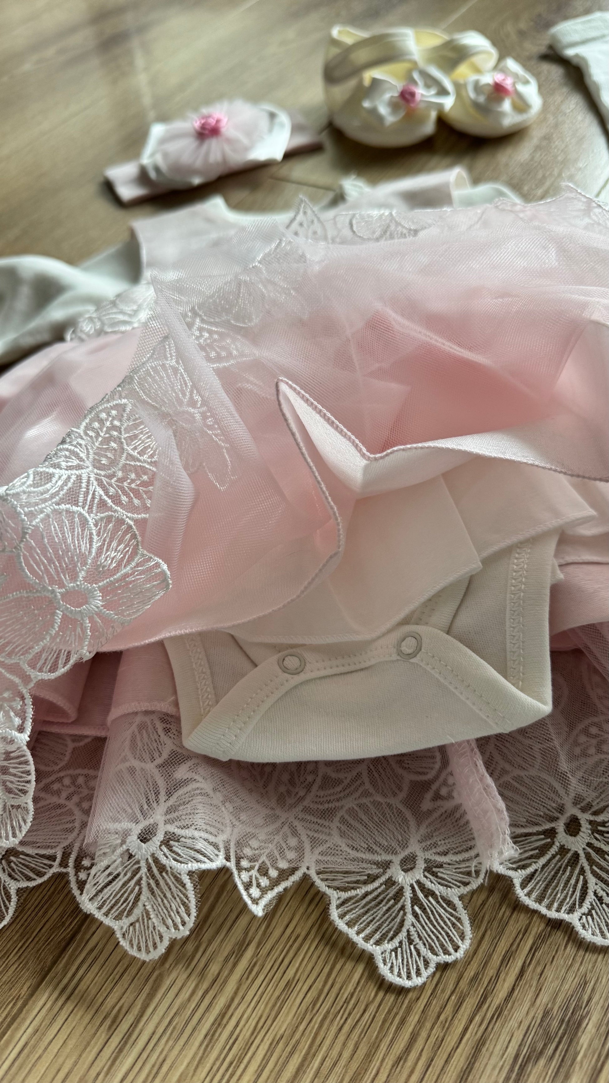 - Güpür detaylı, 6 parçadan oluşan kız bebek takımı.