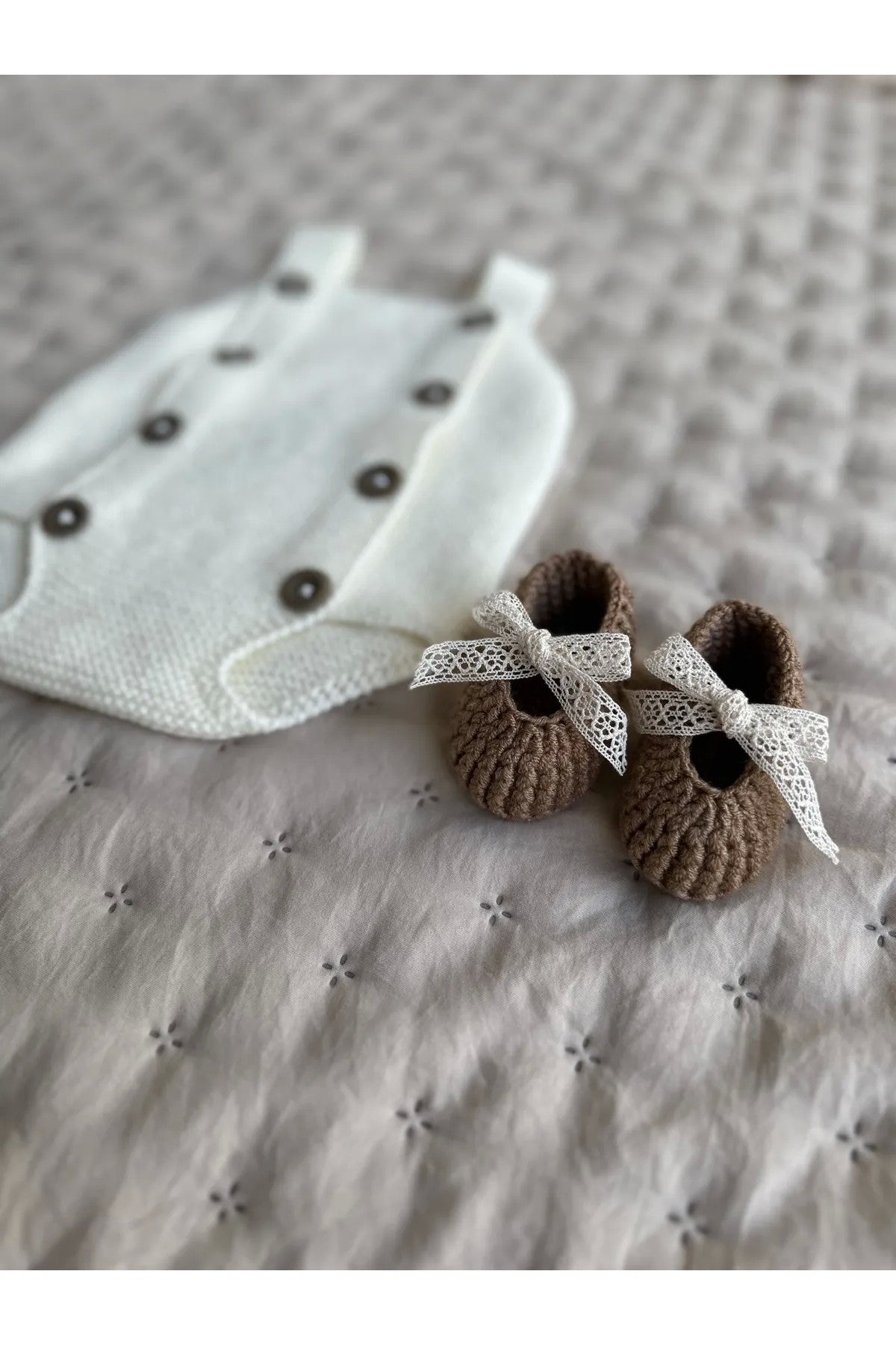 Kahverengi Handmade Güpür Bağcıklı Yenidoğan Kız Bebek Babet