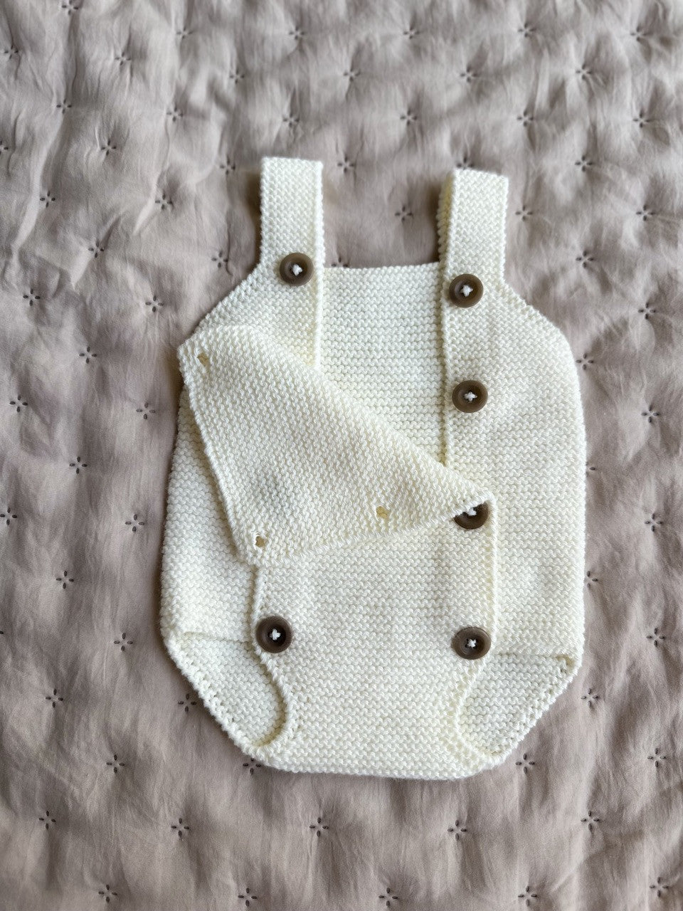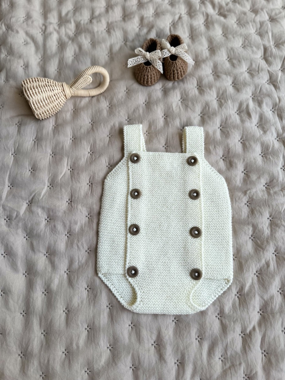 El emeğiyle özenle hazırlanmış bu krem tulum, zarif düğme detaylarıyla şıklık katıyor. Yenidoğan çekimlerinde de mükemmel bir seçenek olan bu tulum, bebeğinizin özel anlarını daha da değerli kılacak.