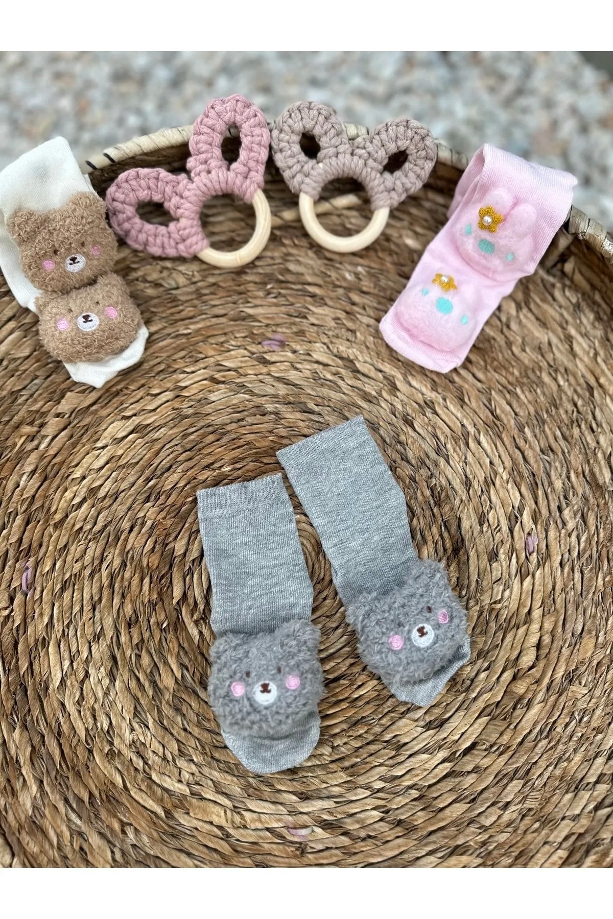 Peluş 3d Oyuncaklı Eğlenceli Bebek Çorabı Gri