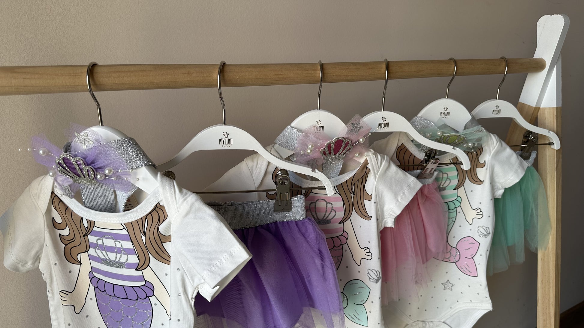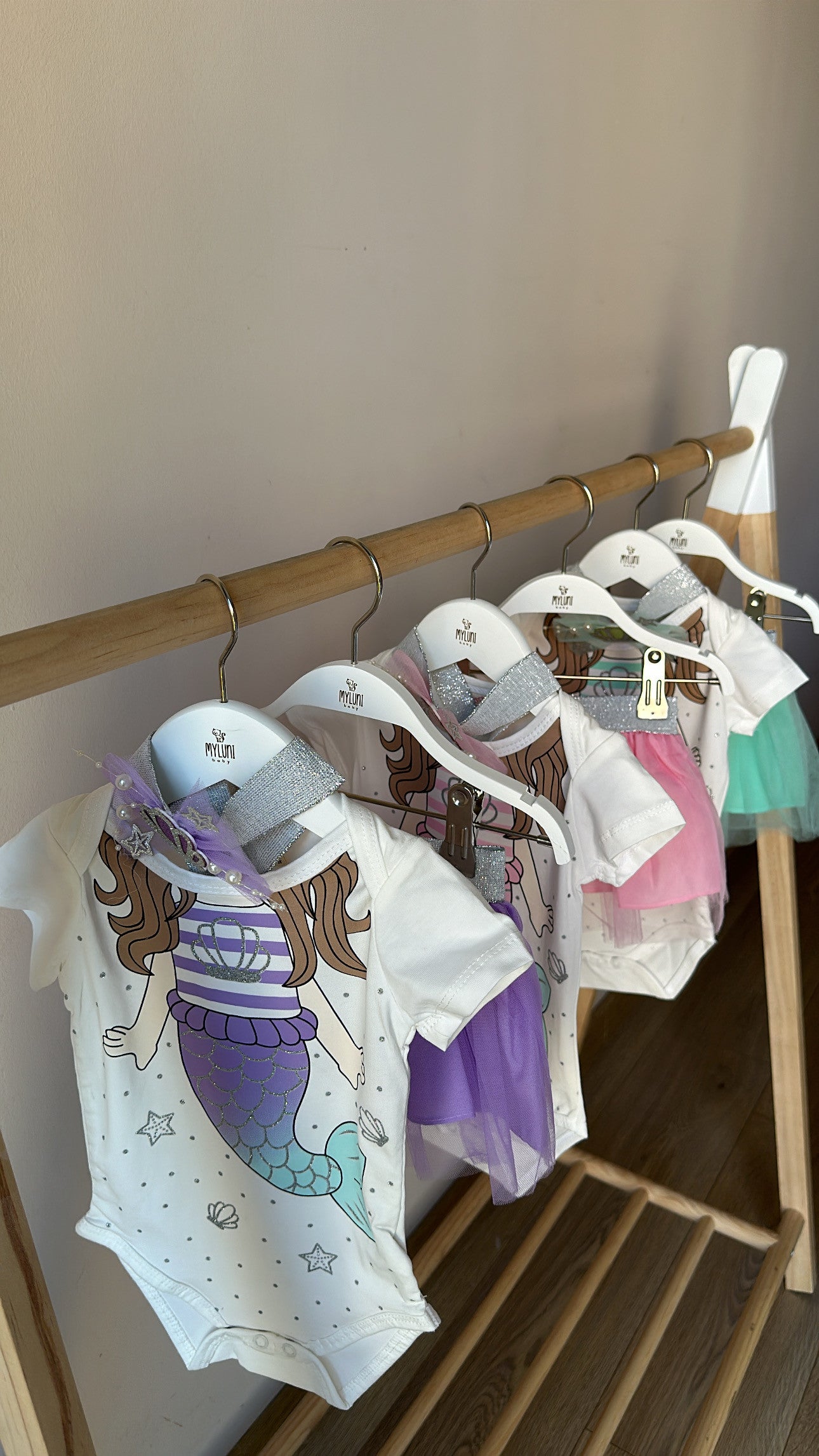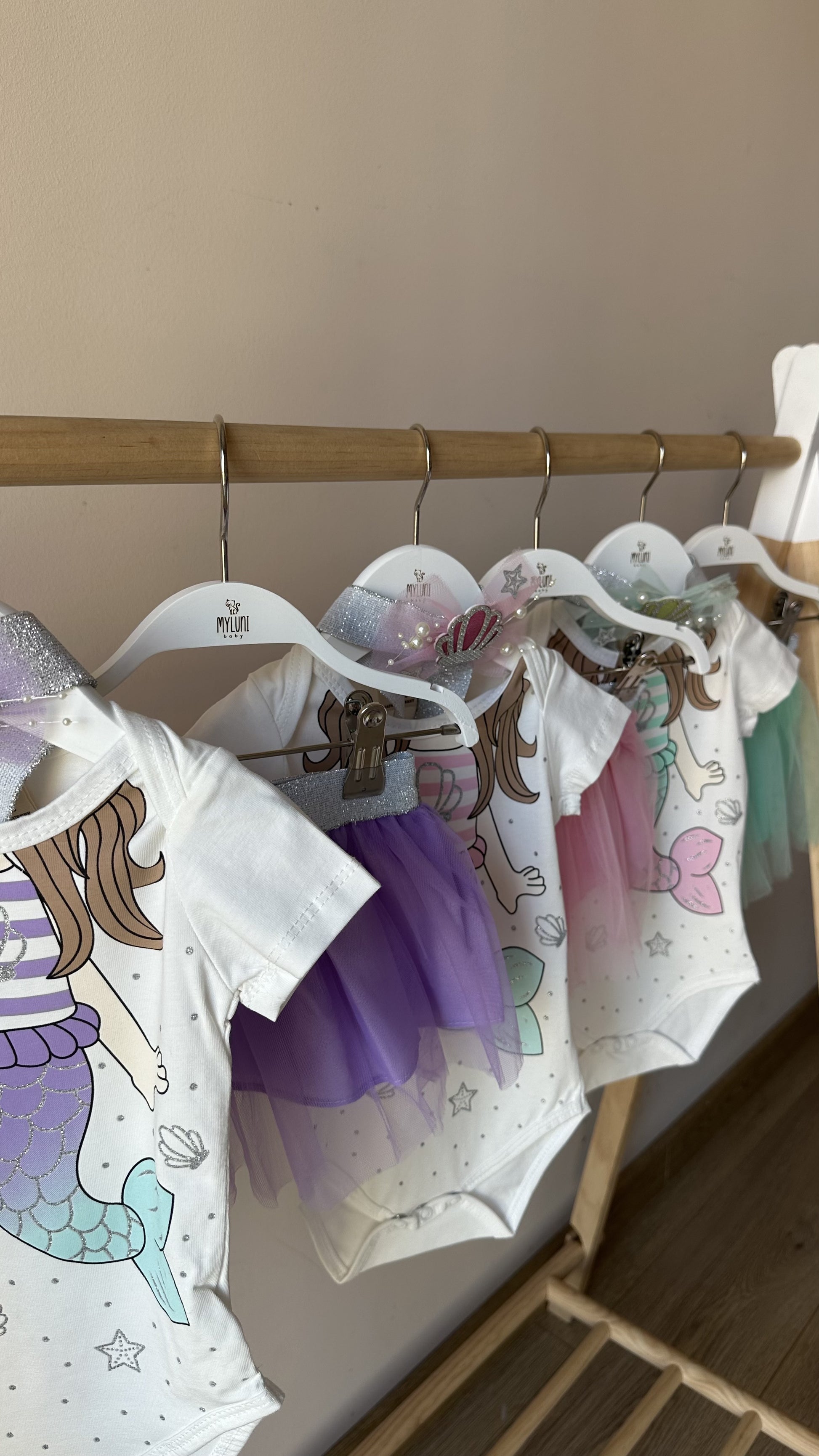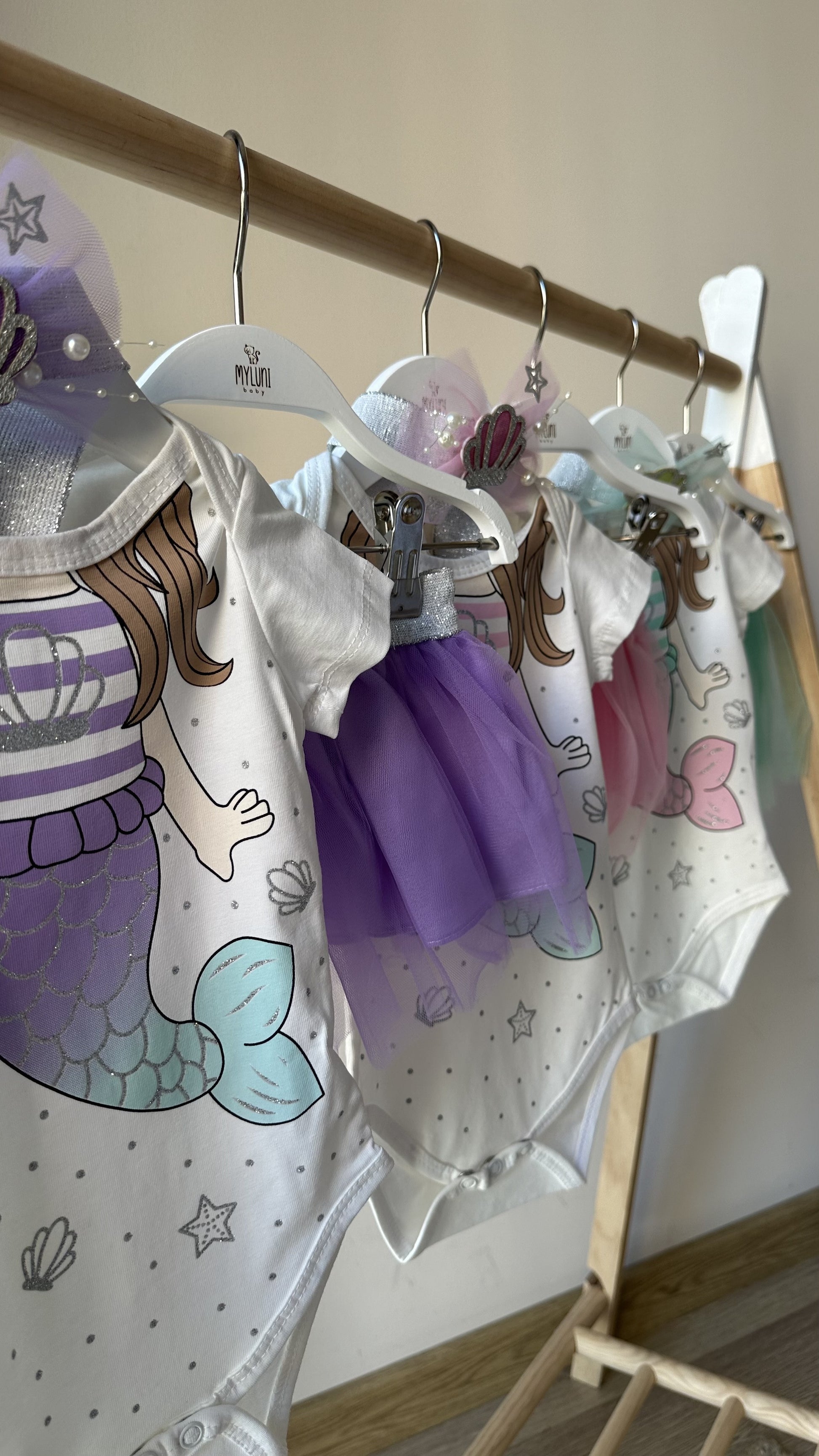 Deniz kızı baskılı, tütü etekli, saç bantlı 3'lü bebek takımı.