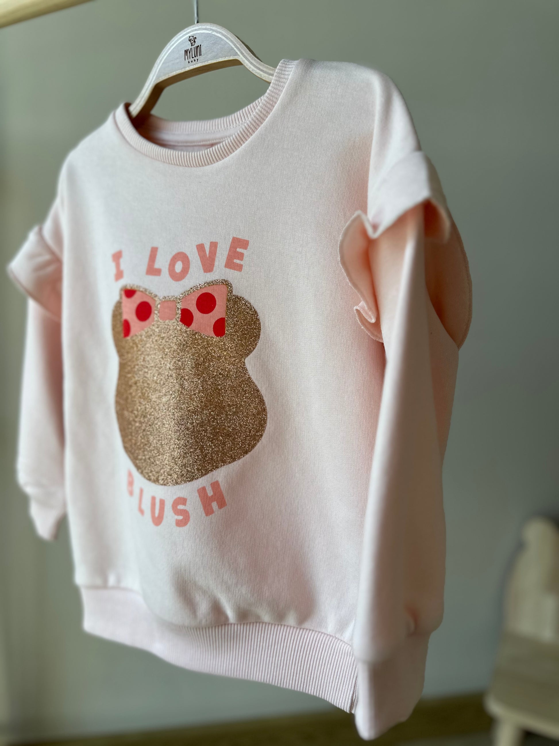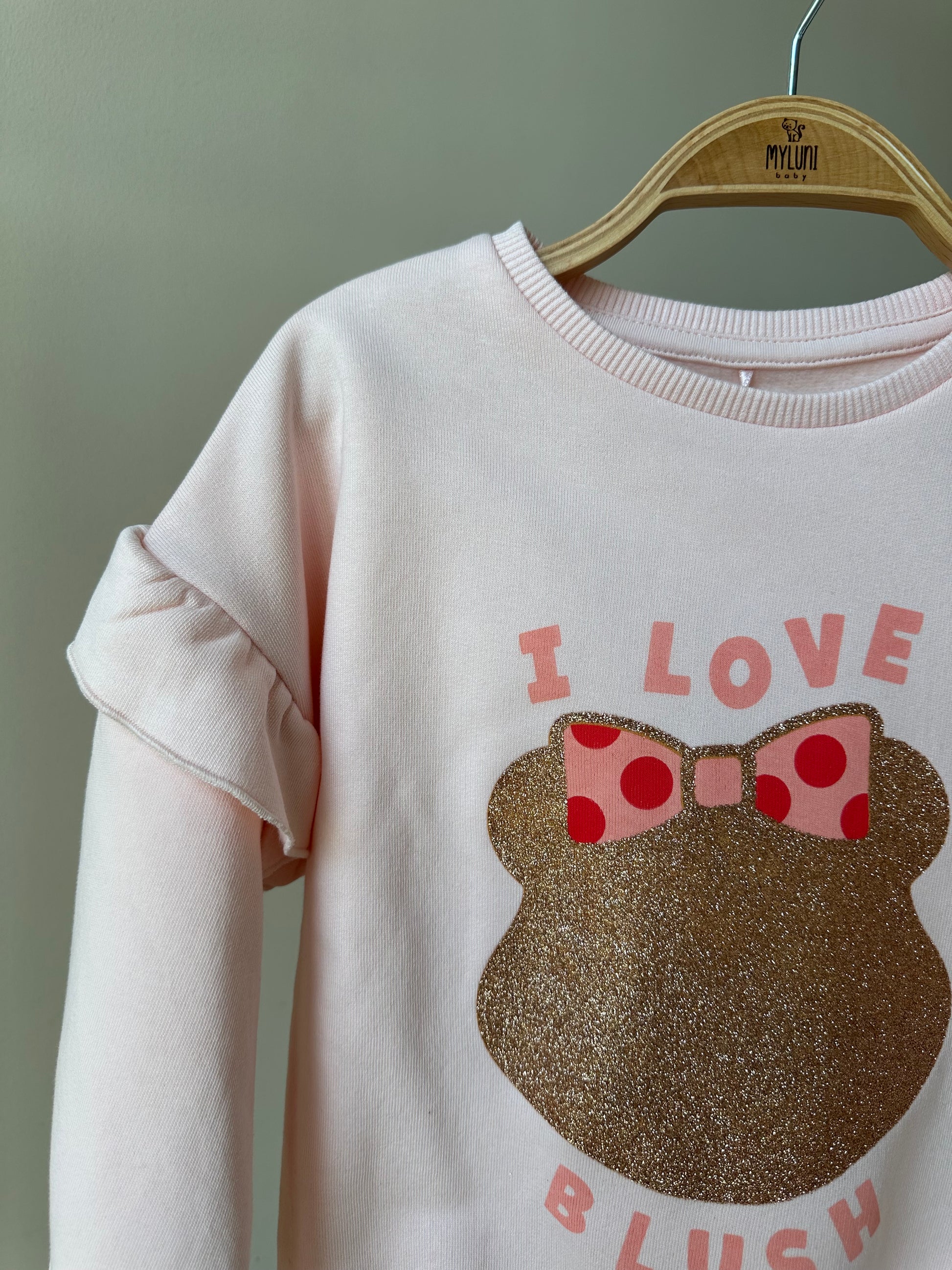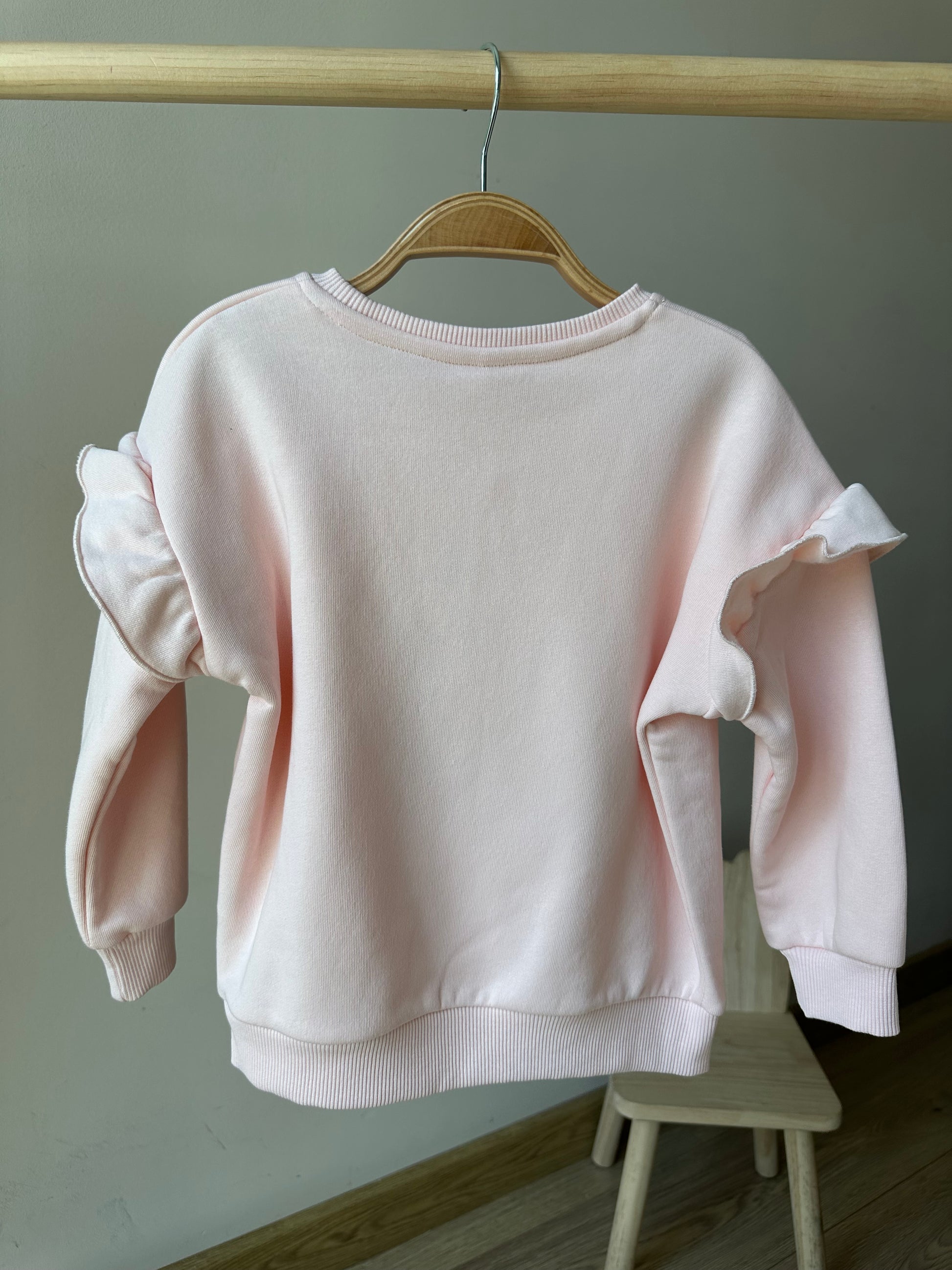 - Bisiklet yaka, omuzları fırfır detaylı, ön bedeni baskılı, uzun kollu kız bebek sweatshirt.
