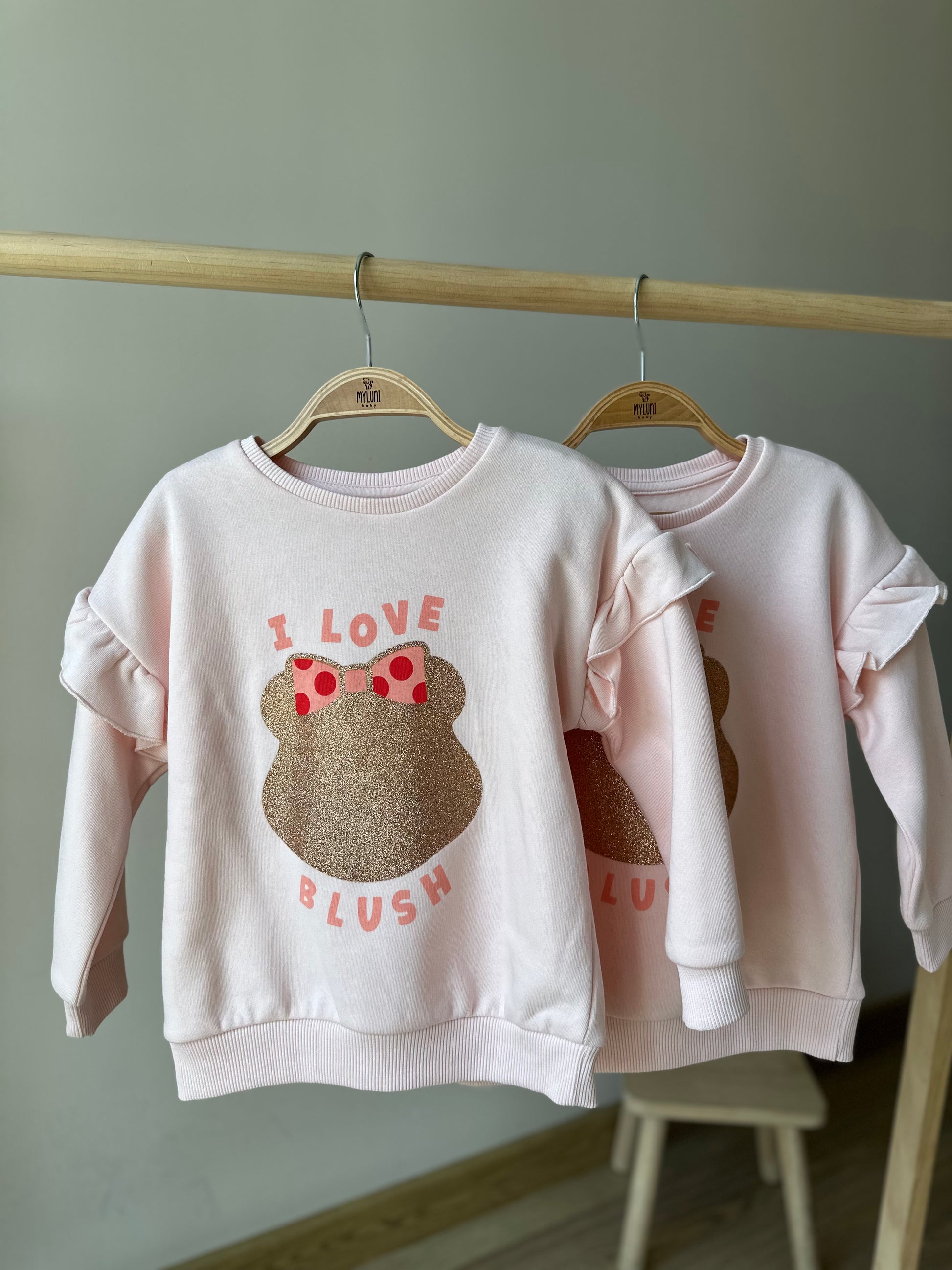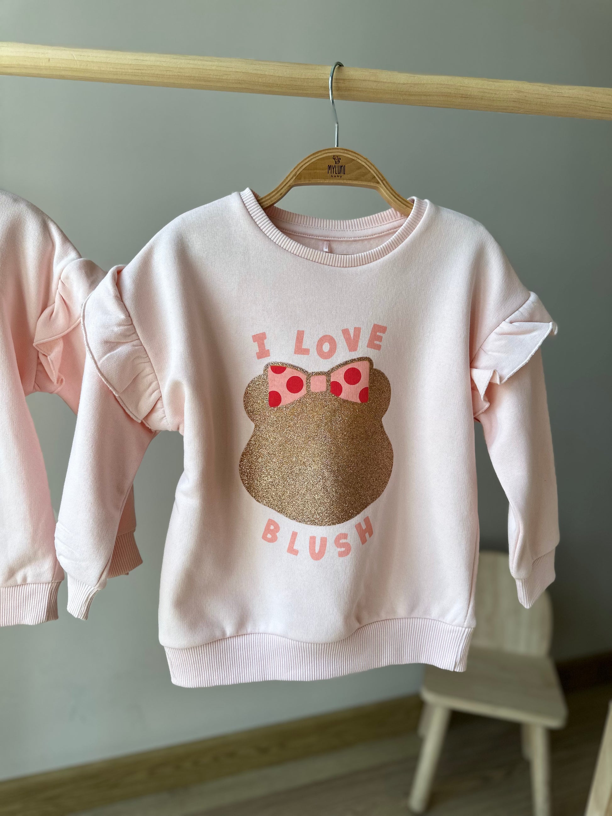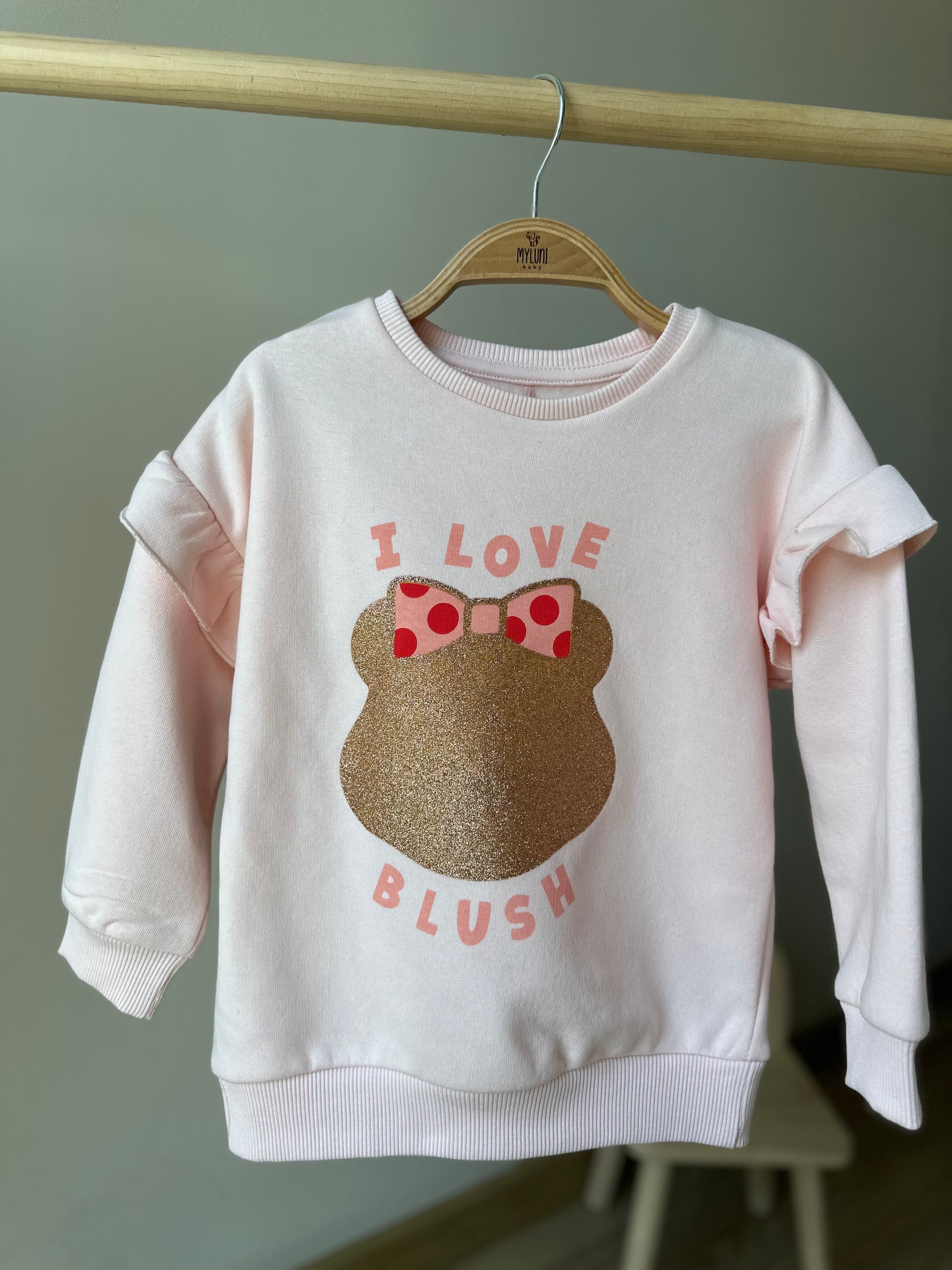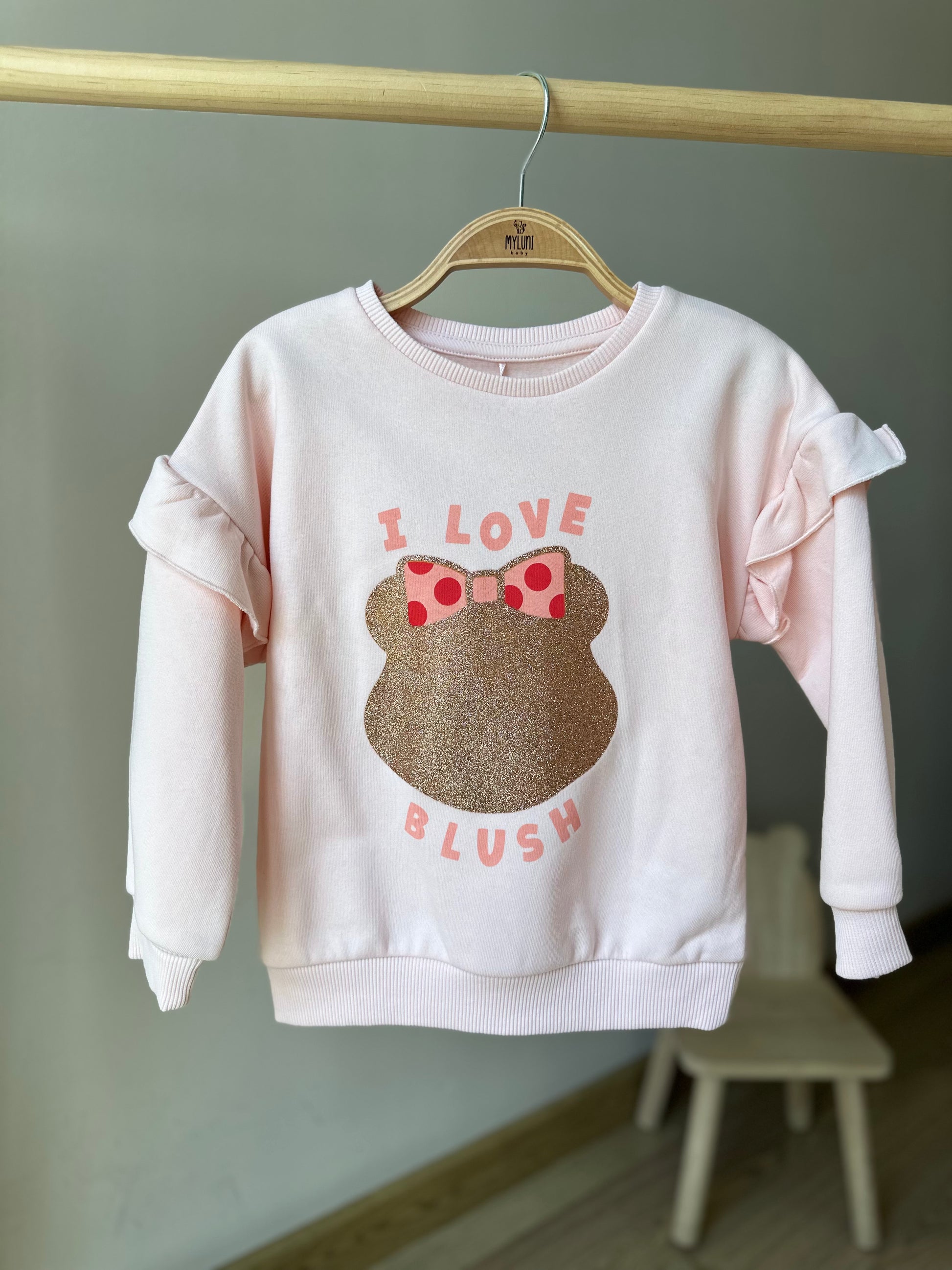 - Bisiklet yaka, omuzları fırfır detaylı, ön bedeni baskılı, uzun kollu kız bebek sweatshirt.