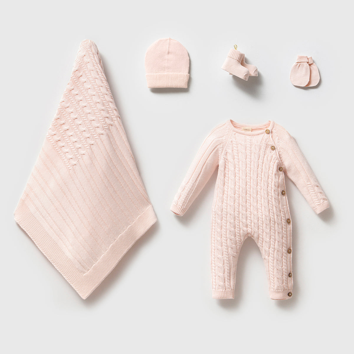 Set içeriği: Saç Örgü Motifli Tulum, Eldiven, Patik, Bere ve Battaniyeden oluşmaktadır.