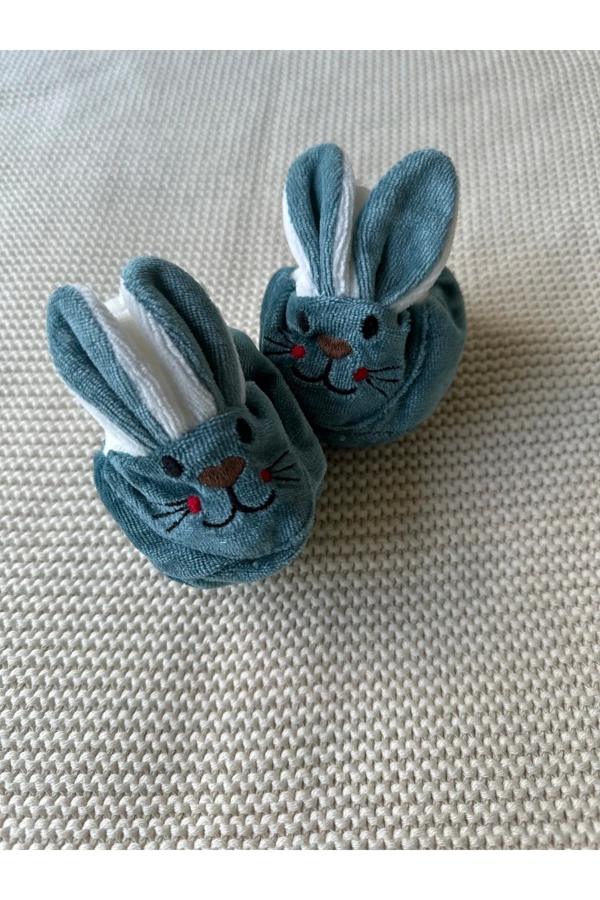 Petrol Mavisi Tavşanlı Kaymaz Tabanlı Kadife Bebek Patiği