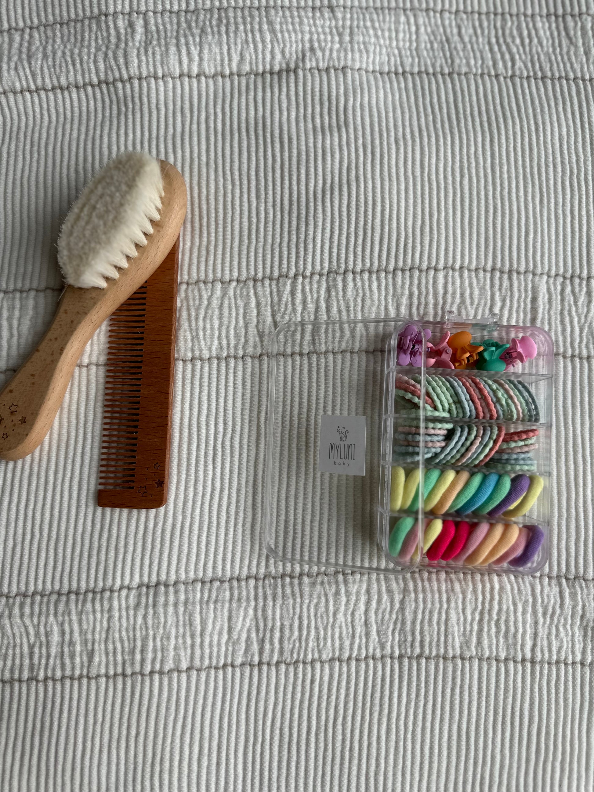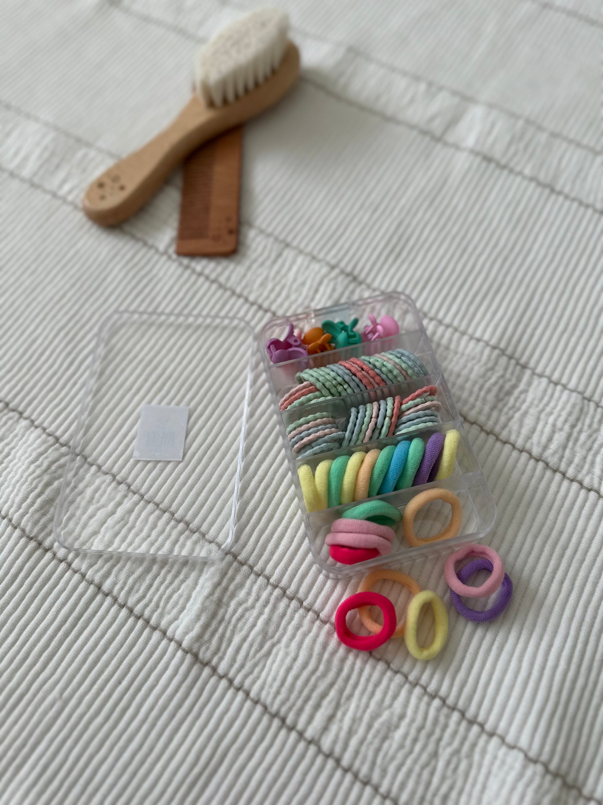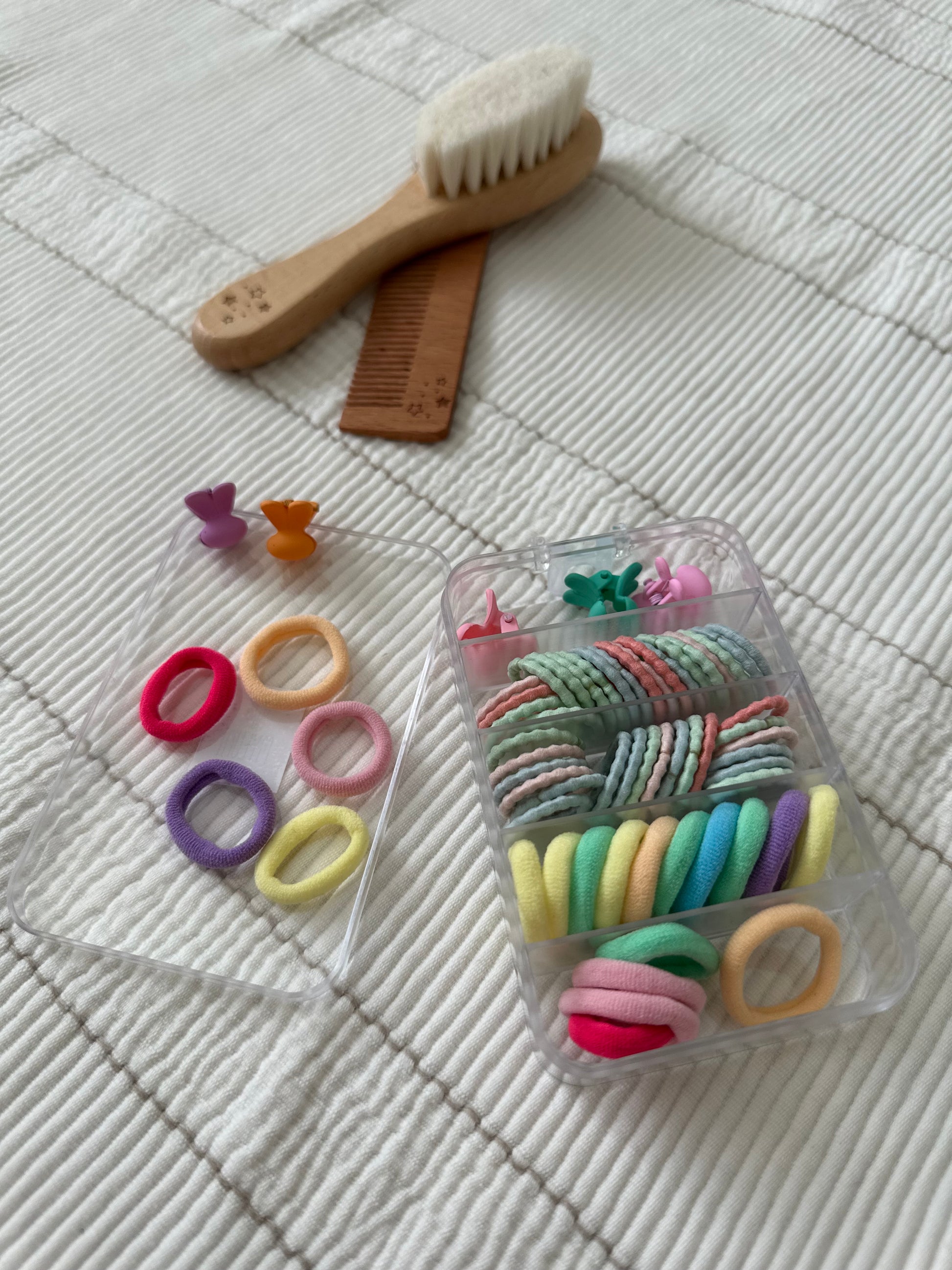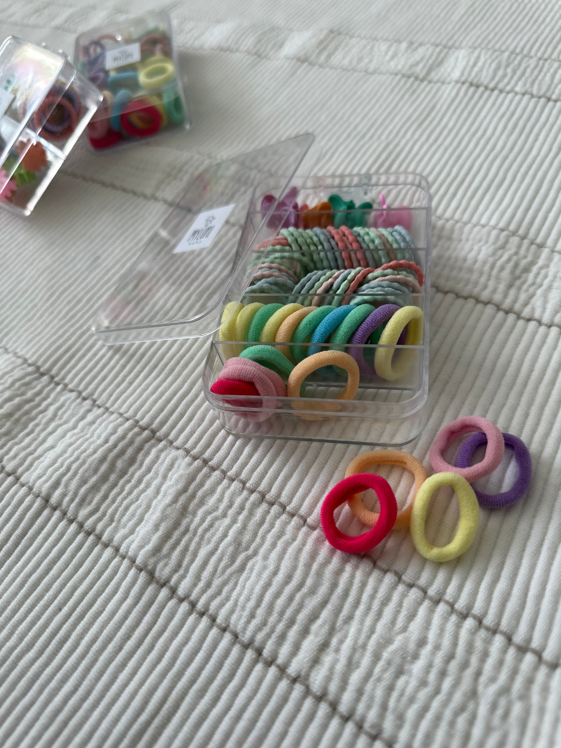 Şeffaf Kutu İçinde Tavşan Kulaklı Mandal ve Karışık Renkli Lastik Saç Tokası.